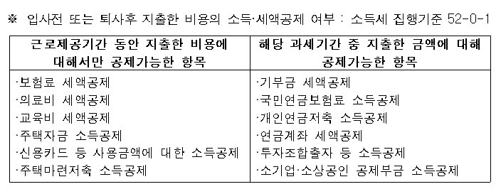 참고로 근로제공기간 동안 지출한 비용에 대해서만 공제 가능한 항목은 다음과 같습니다.