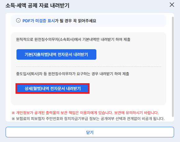 12개월 내내 근무를 하신 분들의 PDF파일은 간단하게 한번에 조회하기 > 내려받기를 하시면 됩니다.